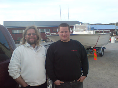 Tuffa grabbar och tufft ekipage - beställaren Helge Överås med sonen Öyvind tar båten på trailer i en riktig långtur - "bara" 980 km hem igen till Vestnes (Ålesund, Norge) - två som kör och fyra hjul som driver - med en diesel V8 på 300 hk skall väl detta gå bra! Vi önskar välgång på land såväl som till sjöss och firar traditionsenligt med pizza-lunch åt alla på Stigfjordbåtar.